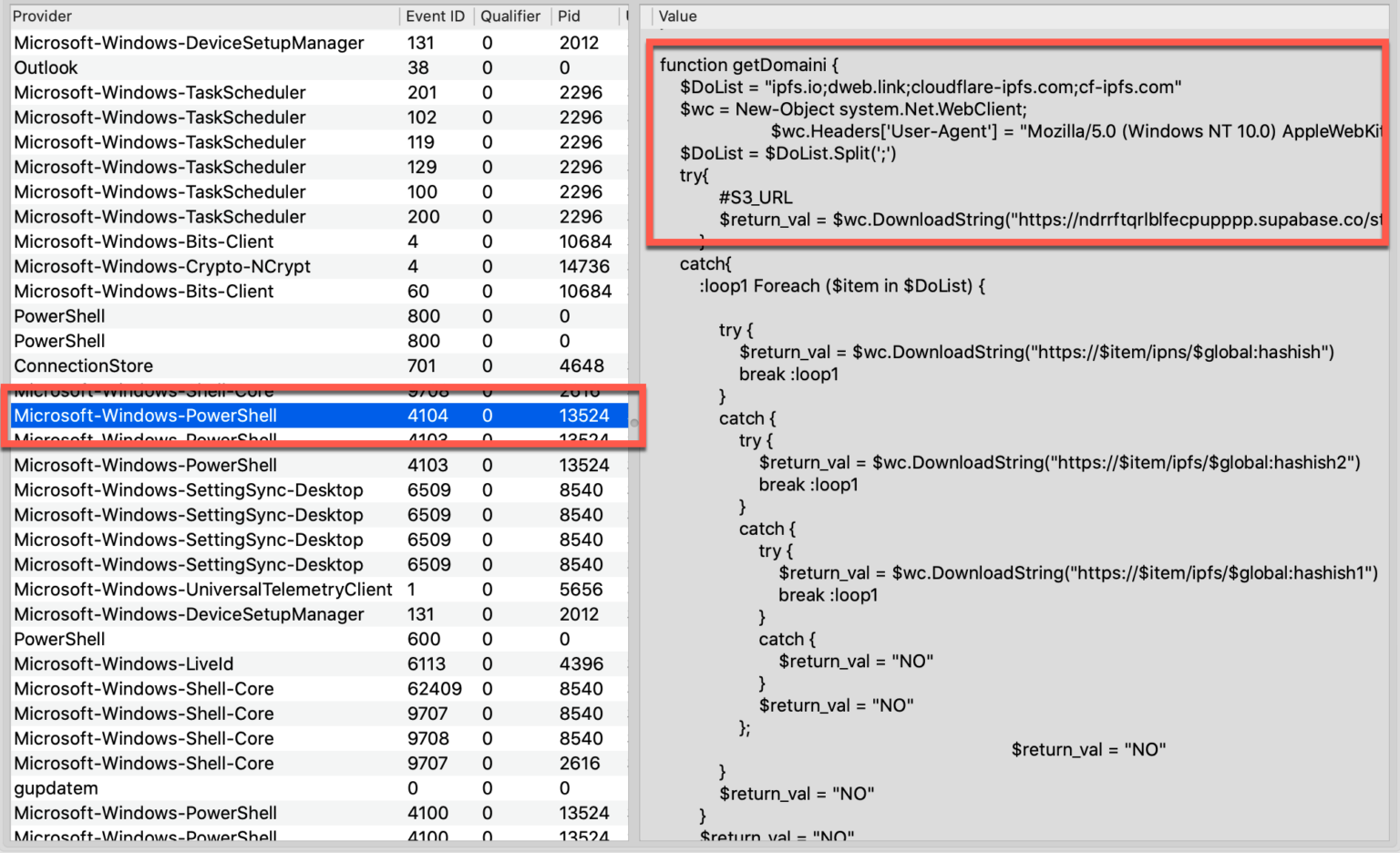 One of Volcano’s automated IOCs (“Bad Powershell”) triggered on a script extracted from event logs. The log contains references to some of the remote systems contacted by the script, including supabase[.]co
