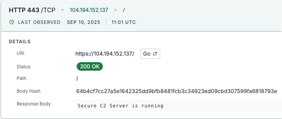 UTA0388 domains are consistently registered and hosted behind Cloudflare. The C2 servers for the WebSocket variant have a default response showing “Secure C2 Server is running”. A screenshot of Censys Platform’s record of this is shown below: