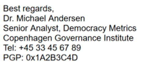 UTA0388 impersonates multiple entities in their phishing emails, but many of these entities are fabrications rather than impersonations of real-world personas. An example of this is shown in the following screenshot of the signature block from a spear phishing message sent by UTA0388. Neither “Copenhagen Governance Institute” nor “Dr. Michael Andersen” are real entities.