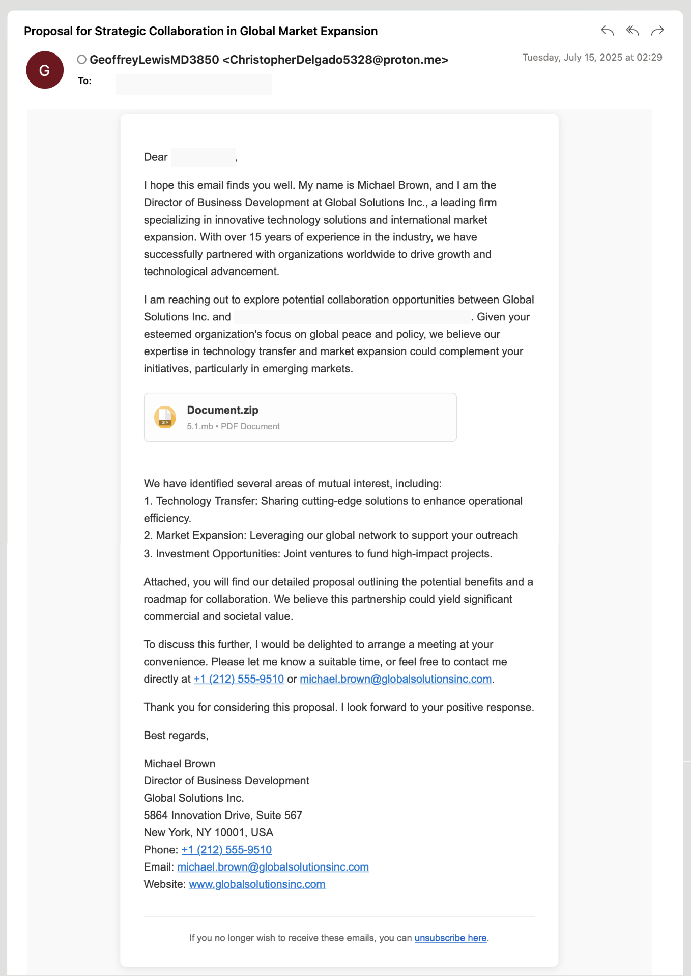 The use of three personas in a single email does not align with human patterns, where a single persona is typically used in order to appear legitimate. Humans do make mistakes, and so more than one may be used accidentally when using a template or not creating new email accounts for different targets. However, the use of three different personas becomes less likely without some kind of automated input. This was also observed repeatedly, which suggests context-unaware automation rather than manual curation. The example email above also provides a fake phone number (starting with “555” after the area code) and invites the recipient to contact them using that number. The domain used in the email, globalsolutionsinc[.]com, is actually registered. However, it is just a parked website and does not have an MX record or accept email at the A records returned for the domain. In short, there would be no way to contact “Michael Brown” at the means specified in the email.